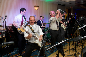 It’s not often that Boston Party Machine has been asked to play Sinatra alongside heavy metal…okay…it’s never happened before. But that’s exactly what Jen and Sean wanted at their wedding reception at Water’s Edge Resort and Spa in CT, and we had a blast doing it! Not only were the bride and groom into music, but so were their guests: at one point, we saw everyone on the dance floor shift from dancing to standing/cheering, as if they were watching a concert. Awesome moment! To add to the singularity of the night, Sean and his friends capped off the festivities by coming up to jam, aided and abetted by Pieter, our drummer (check out the pic below of Sean rocking out on guitar while his friend sings lead vocals). Tons of fun, folks! Photo credit: Creative Image Collections.